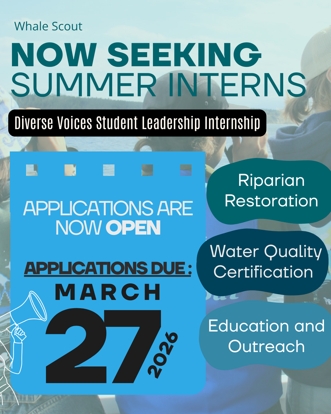 Whale Scout, a nonprofit organization based in King County, Washington is looking for student interns for the summer session to assist with salmon habitat restoration and outreach and education activities with diverse audiences. Dedicated to protecting Pacific Northwest whales through land-based conservation experiences, Whale Scout takes a boots-on-the-ground approach to recovering endangered Southern Resident killer whales and the salmon they rely upon. We acknowledge that we are on the ancestral lands of the Coast Salish people, and recognize that certain local communities of color are disproportionately impacted by lack of salmon, poor water quality, and access to outdoor environmental experiences and education. Our programs, including this internship, work to address these issues. We are seeking applicants whose backgrounds, experiences, language skills, and interests align with environmental justice goals related to Puget Sound. This internship will offer students the opportunity to learn about killer whales, salmon habitat, native vegetation, communication, community building, non-profit organizational management, and become certified water quality monitors. It will offer those 16 and older field experience educating the public including diverse communities. The summer internship may also include opportunities to participate in a field trip to San Juan Island and Ballard Locks. No prior experience is required for the program. Interns are offered $24/hr at 18 hours per week.