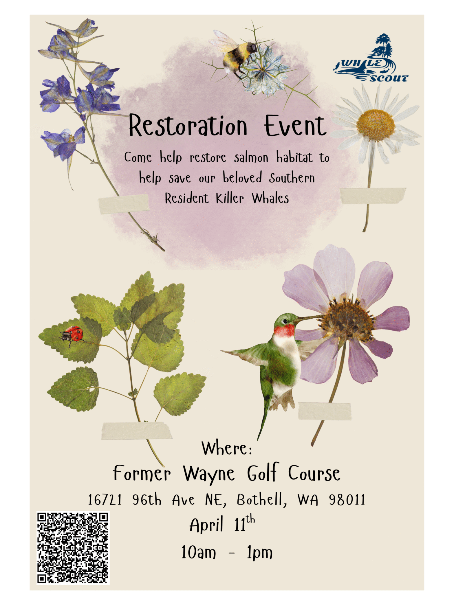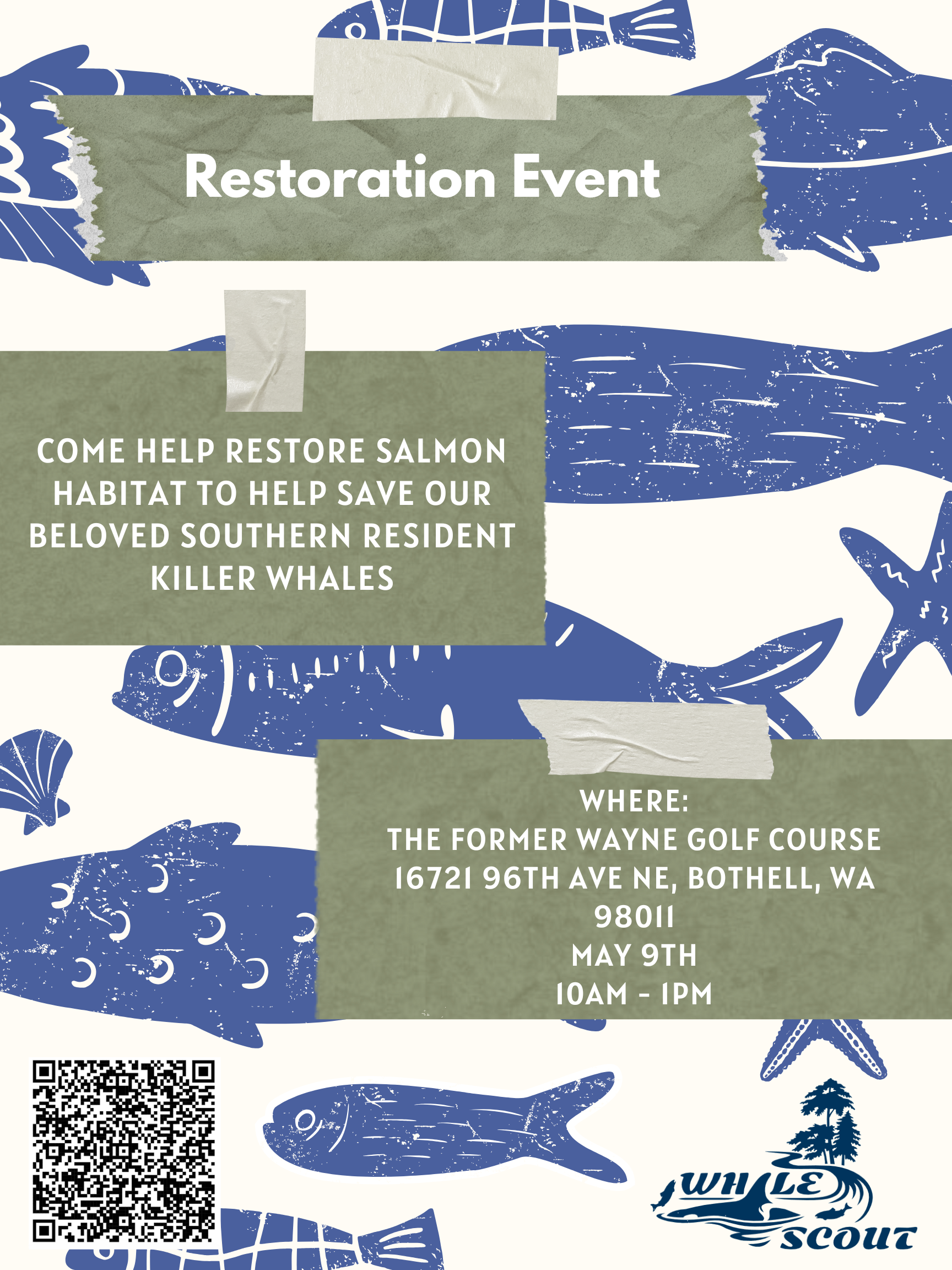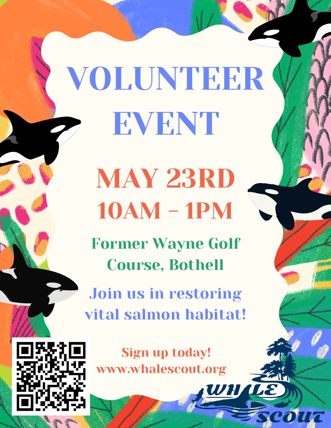 Endangered Southern Resident killer whales depend on salmon as a critical prey resource from watersheds in Puget Sound and beyond. Salmon use the Sammamish River as a migratory corridor. Improving the water quality in the river will help both struggling salmon populations and orcas. Join us to care for new native plantings at the former Wayne Golf Course. Vegetation will help shade and cool and clean a small stream emptying into the Sammamish River. Healthy riparian forests control erosion of riverbanks and host insects’ young salmon need early in life. The former Wayne Golf Course features nearly a mile of shoreline and is the largest City of Bothell Park. Activities will take place on the west side or “front nine.”