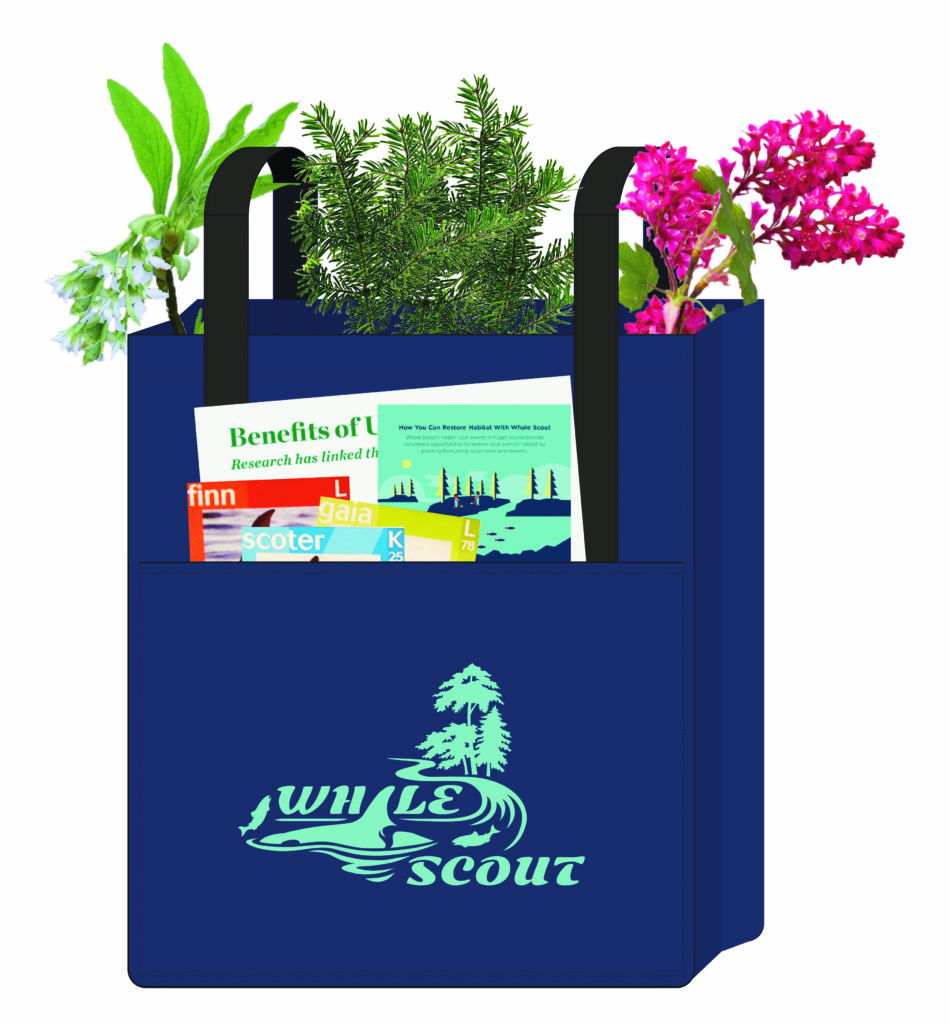 While we stay safe at home, there are still so many ways to help recover endangered orcas. Whale Scout is offering free Orca Conservation Kits safely delivered right to your door celebrating Orca Action Month. Kits include native shrubs to plant in your yard and information and activities connecting these plants to salmon and orcas for the whole family – all in a reusable shopping bag!