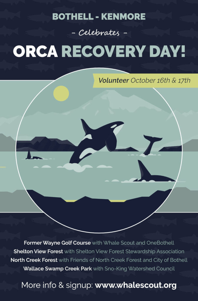 Recognizing this tight connection between local communities, salmon, and orcas shared through our waters, the regional conservation districts created Orca Recovery day in 2018. Initially born out of the fallout from the tragic story of Tahlequah and her dead newborn calf, whom she carried for 17 days and over 1,000 miles, Orca Recovery Day has engaged thousands of people each year in on the ground projects that make a difference. This year local groups in Bothell and Kenmore are joining together to celebrate Orca Recovery Day at four events! Each event will offer families of all ages a variety of hands on stewardship and educational activities.