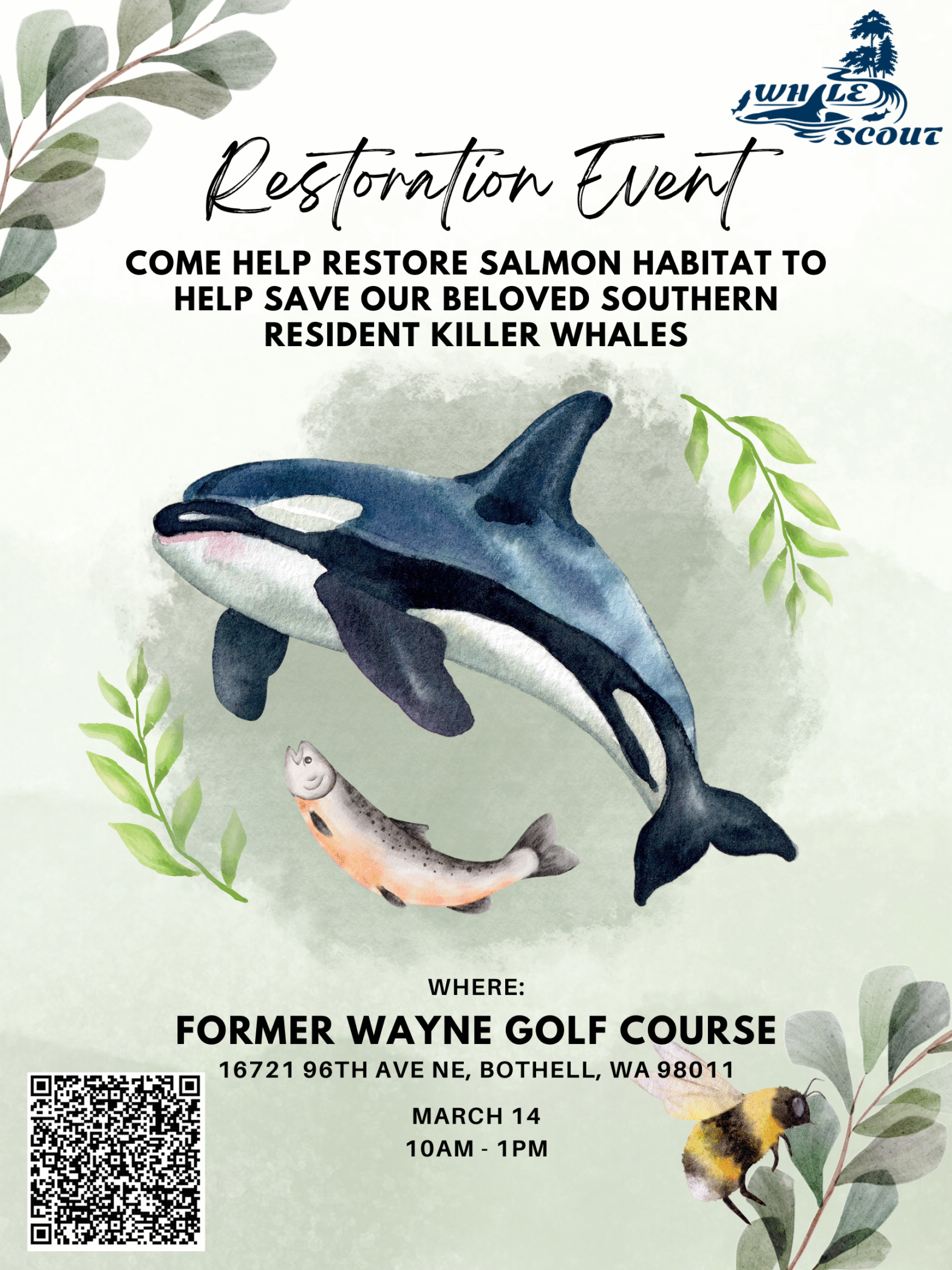 Sign up! Join us for a habitat restoration event! Endangered Southern Resident killer whales depend on salmon as a critical prey resource from watersheds in Puget Sound and beyond. Salmon use the Sammamish River as a migratory corridor. Improving the water quality in the river will help both struggling salmon populations and orcas. Join us to …