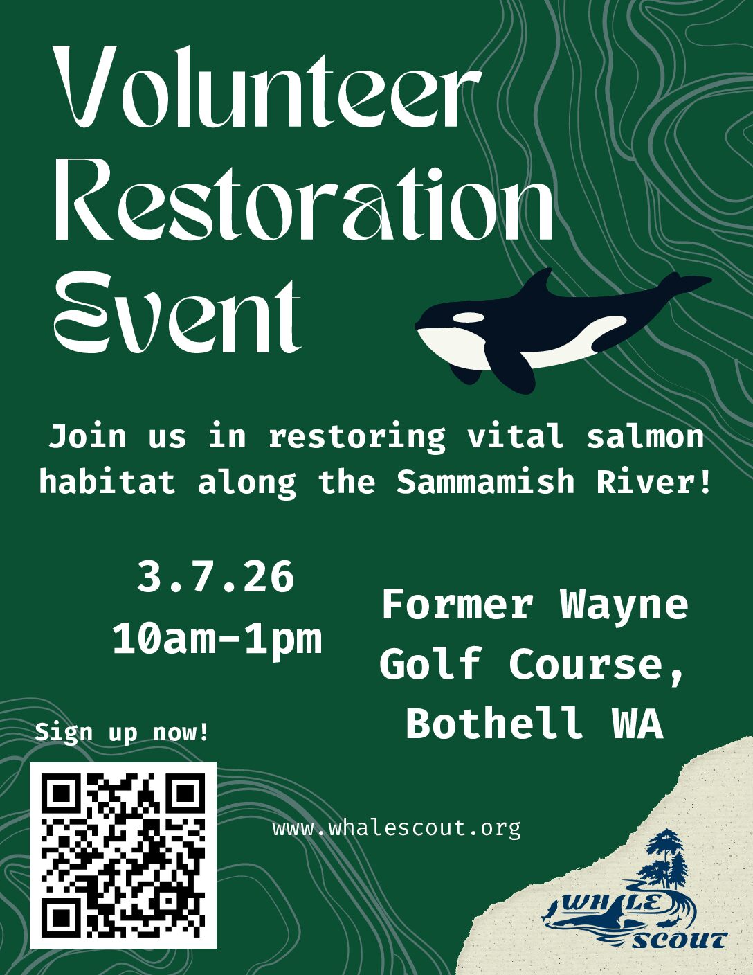 Sign up! Join us for a habitat restoration event! Endangered Southern Resident killer whales depend on salmon as a critical prey resource from watersheds in Puget Sound and beyond. Salmon use the Sammamish River as a migratory corridor. Improving the water quality in the river will help both struggling salmon populations and orcas. Join us to …